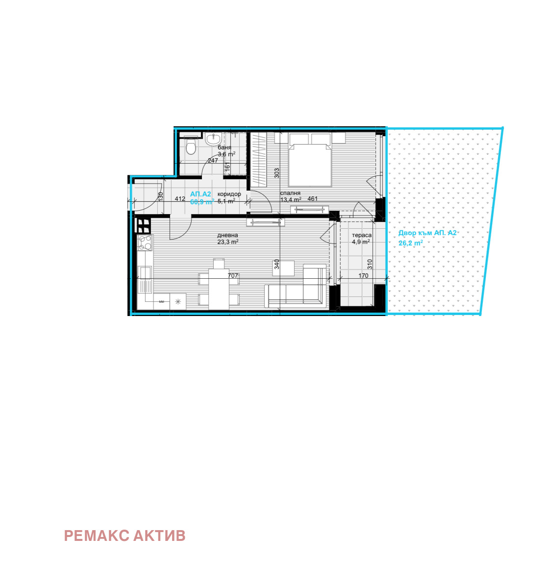 двустаен апартамент, разположен на първия етаж от общо 10. Общата застроена площ е 69,96 кв. м (60,85 м2 жилищна площ. Разпределението е следното: коридор, спалня, баня с тоалет, дневна с кухня и излаз на тераса от двете стаи, има и излаз на тераса/дворче с площ 25,50 кв. м.