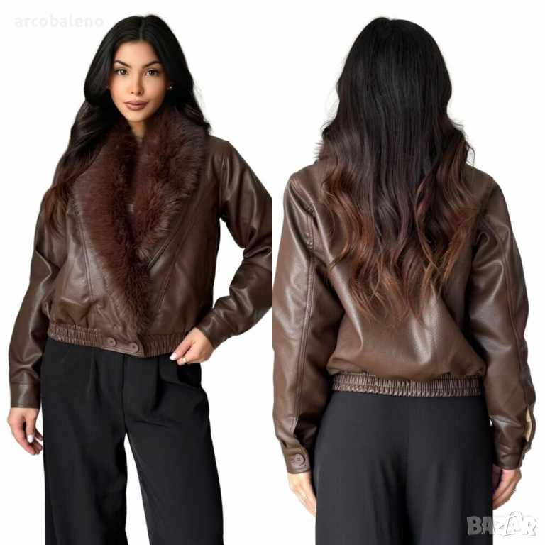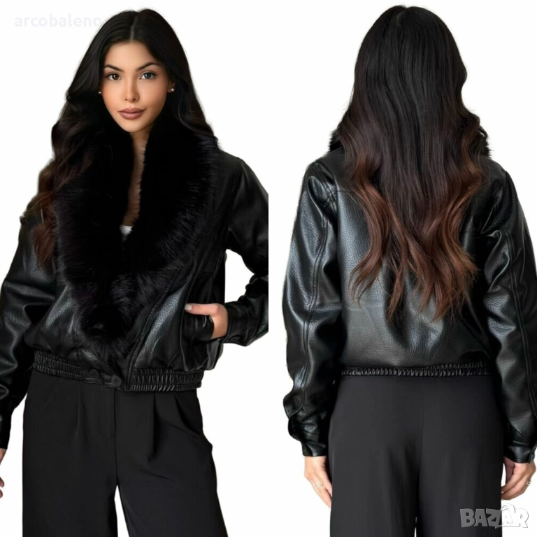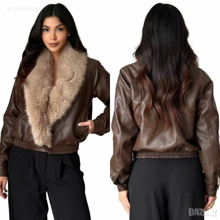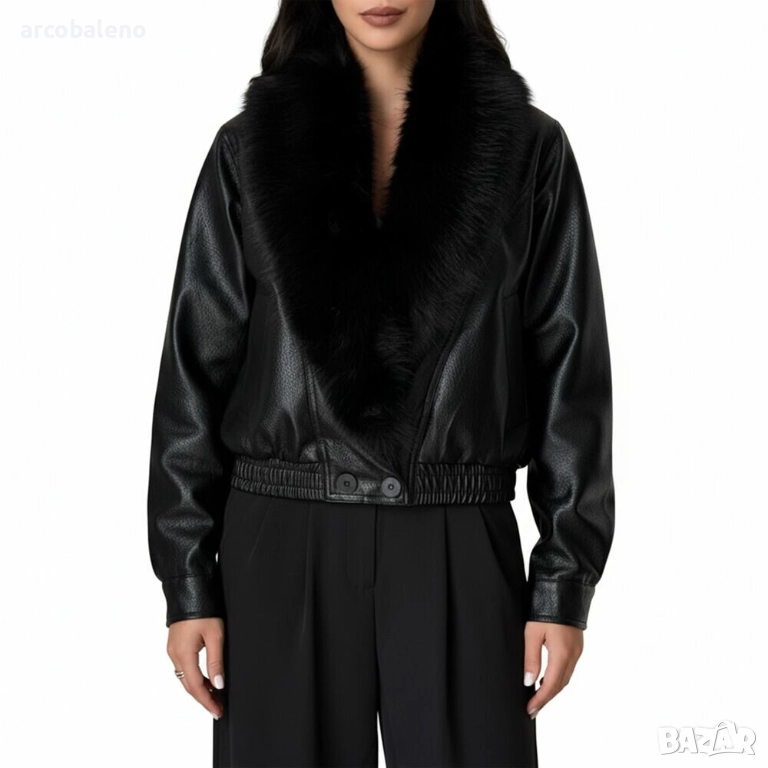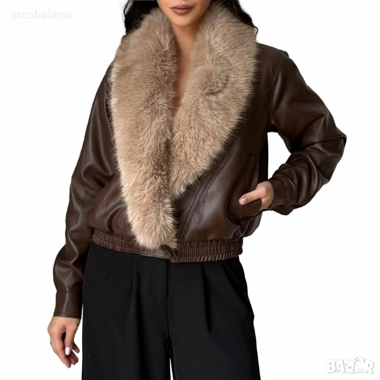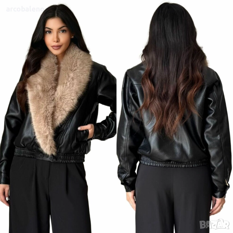 Дамско късо яке от изкуствена кожа, подчертано от широка яка от ултра мека бежова изкуствена кожа. Леко овърсайз кройката и еластичната талия добавят модерен и елегантен щрих.