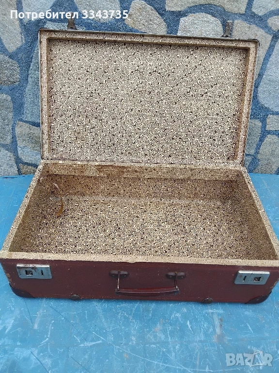 Продавам винтидж куфар характеризиращ се със здрава конструкция и класически дизайн.Най вероятно е направен от пресован картон,покрит с винилово или жакардово покритие имитиращо кожа.Има класически правоъгълен дизайн със подсилени ъгли и декоративни ленти през горната част и ключалки.Всичко се вижда на снимките за размери пишете на л.с.