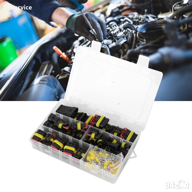 комплект конектори от 352 части, предназначен за създаване на надеждни, водоустойчиви електрически връзки за автомобилни, морски и промишлени приложения. Този комплект осигурява превъзходна защита срещу вода, прах, мръсотия и вибрации, като осигурява връзки за фаровете на вашето превозно средство (HID/LED), сензори, озвучителни системи и други електрически аксесоари. За разлика от изолирбандната лента или обикновените конектори, тези конектори са сменяеми, осигурявайки професионално и дълготрайно решение. Комплектът включва всички корпуси, клеми и водоустойчиви уплътнения, за да отговори на вашите нужди от 1, 2, 3 и 4-пинови конектори в кутия за съхранение с отделения.
