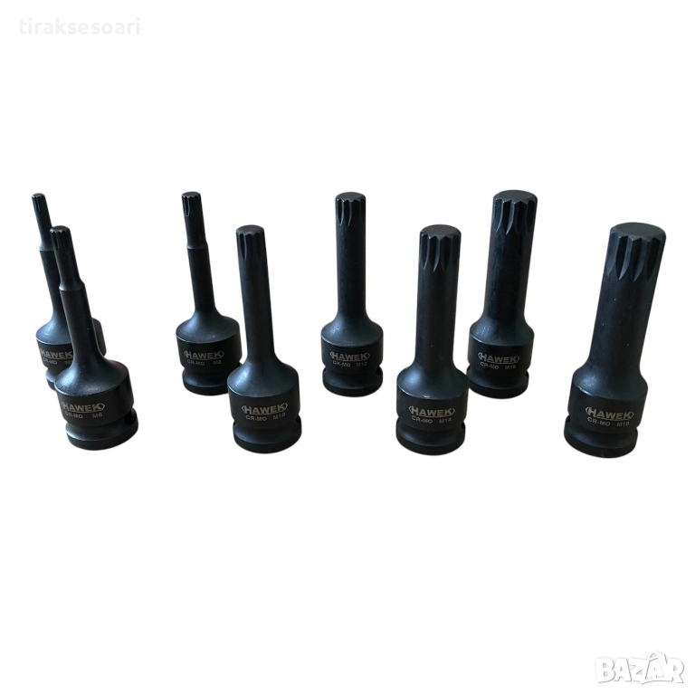 hawek hw2052, spline битове 8 части, ударни битове cr-mo, spline m5-m18, ударни битове 1/2 hawek, професионален комплект spline