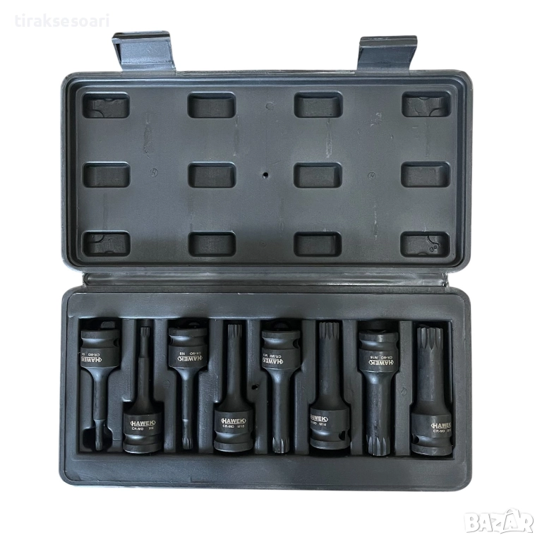 Професионален комплект ударни SPLINE битове HAWEK HW-2052 – 8 части, 1/2", Cr-Mo