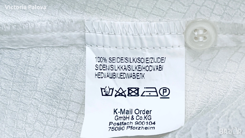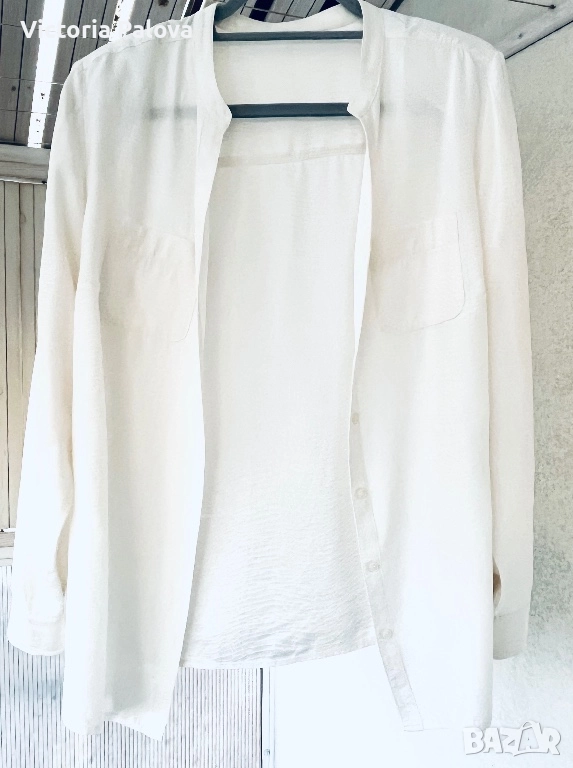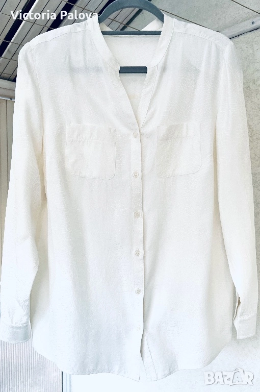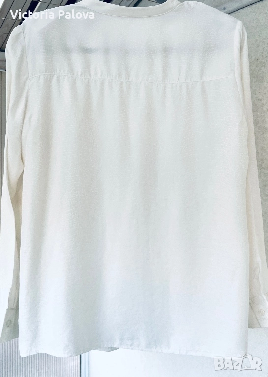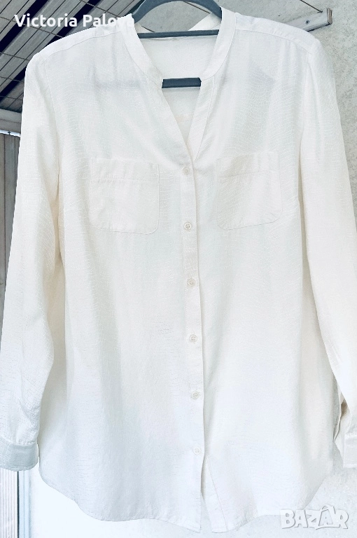 Елегантна кремаво- бяла риза от 100% чиста sandwached silk - коприна с фин “пясъчен” ефект: леко матирана, невероятно мека, с усещане за лукс. Чиста заоблена линия на деколтето , два симетрични джоба на гърдите, дълги ръкави с тесни маншети и малки седефени копчета по предницата. Кройката е свободна, леко овална, пада красиво и леко се разширява надолу. Цветът е топъл кремав нюанс ivory. Това е рядка sandwached silk blouse, която изглежда скъпо дори в най- простата си форма- тъканта е лека и въздушна, усеща се като пух. Рамо с леки подплънки - 43см, ГО - 56см, дължина - 79см, ръкав - 59см. Европейски размер 42.