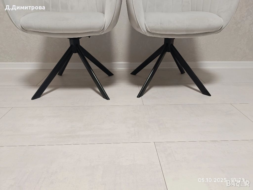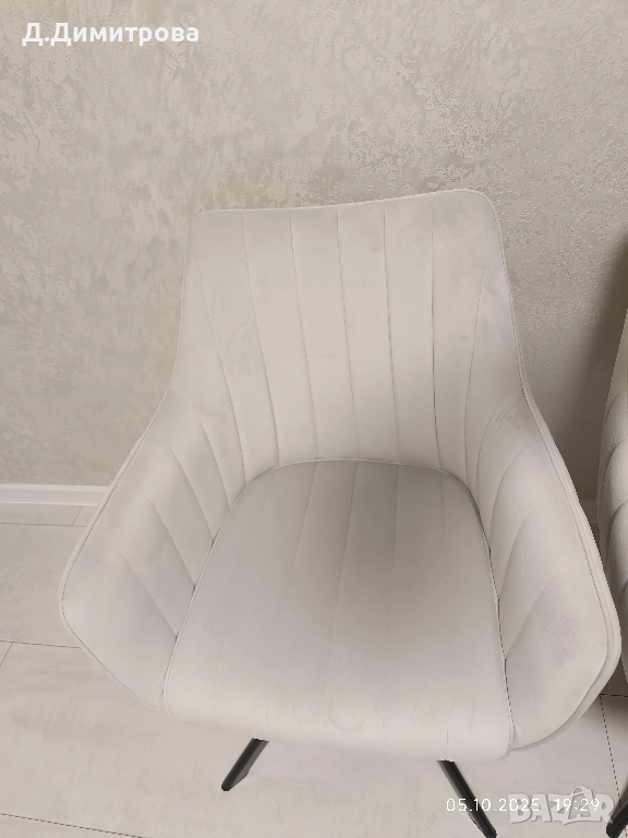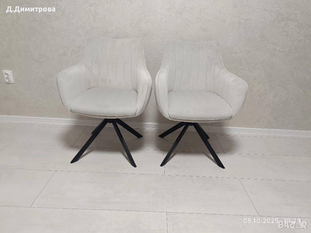 Закупени са преди два месеца, преди поставяне на кухнята. След като я поставиха, мястото ни се ограничи и двата стола са излишни. Дамаската е специализирана за почистване с мокра кърпа, не задържа петна. Столове се въртят на 180° градуса. Цена за стол. Намират се в Пловдив. Цвят бледо сив, изключително светъл.