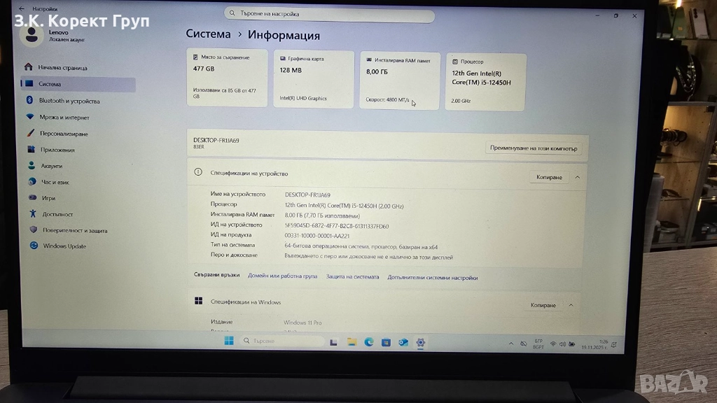 Лаптоп Lenovo IdeaPad Slim 3 15IAH8, Intel® Core™ i5-12450H, 15.6" Full HD, 8GB LPDDR5, 512GB SSD Арт. номер: 75006