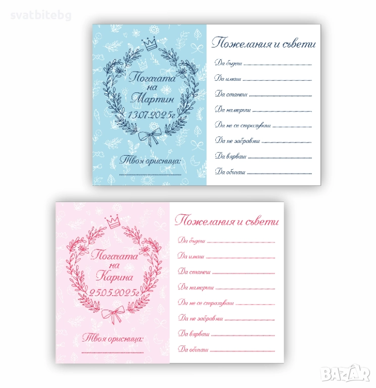 Карти за Наричане: персонализирани, с място за пожелания от гостите. Перфектният начин да съберете всички добри пожелания за здраве, щастие и късмет.