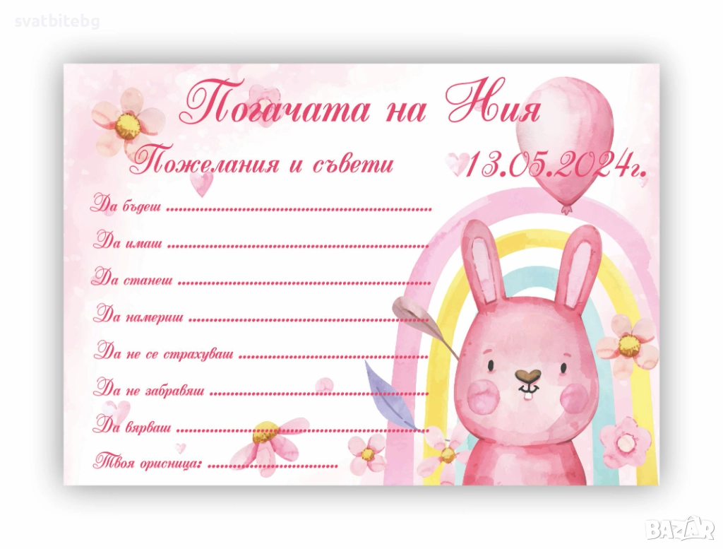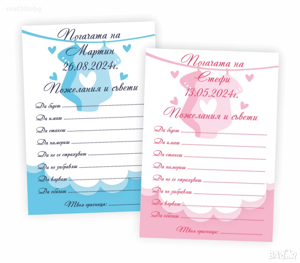 Карти за Наричане: персонализирани, с място за пожелания от гостите. Перфектният начин да съберете всички добри пожелания за здраве, щастие и късмет.