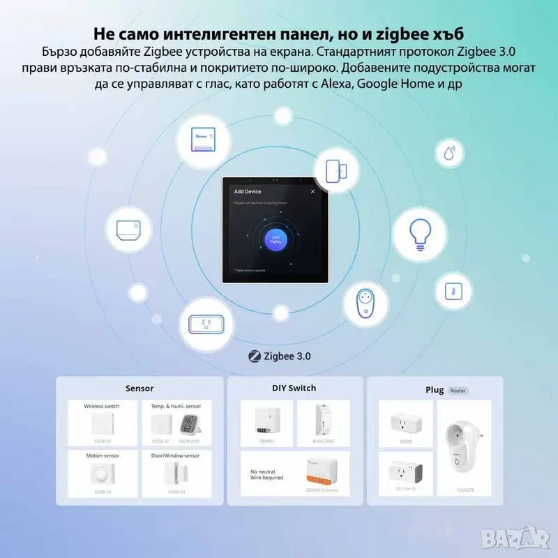 – NSPanel Pro може бързо да добавя Zigbee устройства на екрана. Стандартният протокол Zigbee 3.0 прави връзката по-стабилна и покритието по-широко. Поддържайте всички SONOFF Zigbee устройства като SNZB-01P, SNZB-02P, ZBMINIL2.
