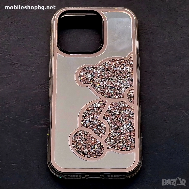 iPhone 16 Pro огледален кейс мече с камъчета розов → Обява 52462015