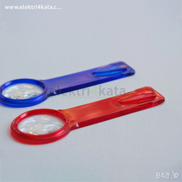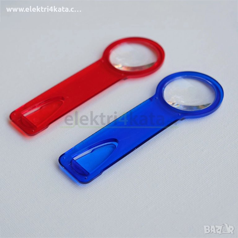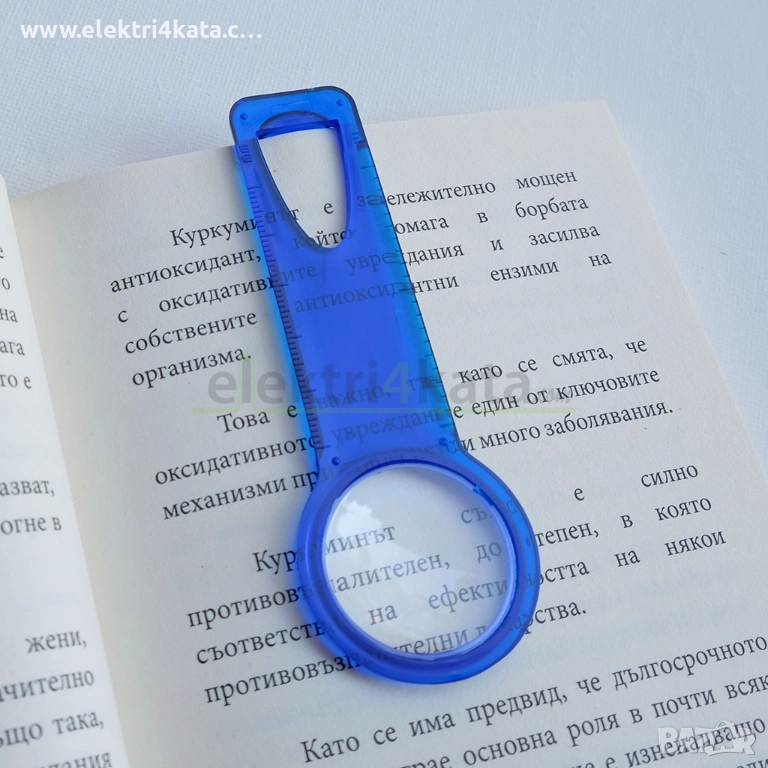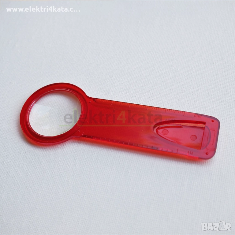 Книгоразделителят с лупа е изработен от устойчива пластмаса, дължината му е разграфена в сантиметри, а за улеснение е добавена и лупа.