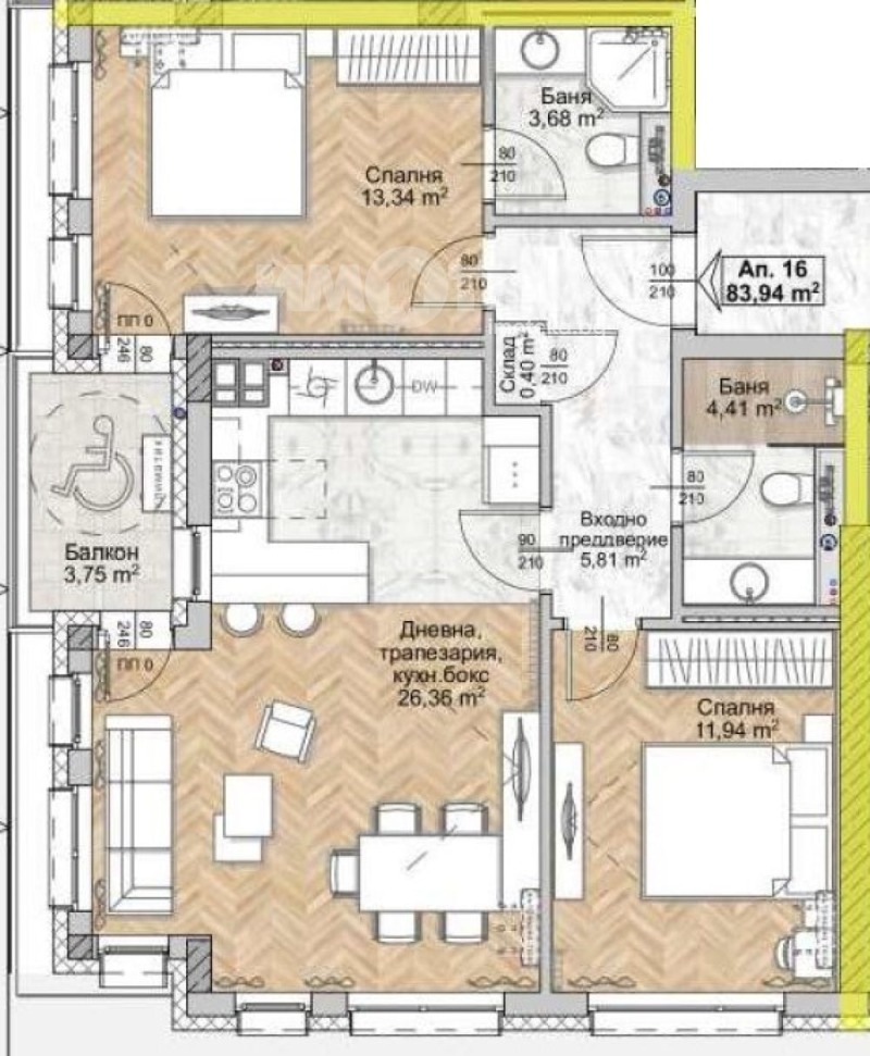 Върху площ от 97 кв.м са разположени хол с трапезария и кухненски бокс (26 кв.м), две спални съответно 12 и 13 кв.м, две бани и балкон.