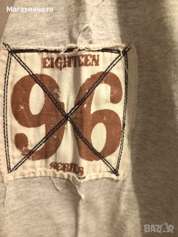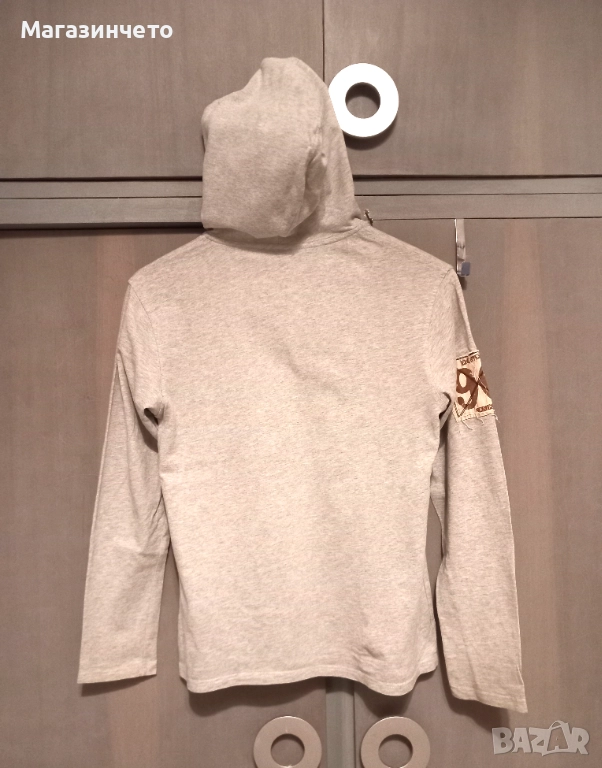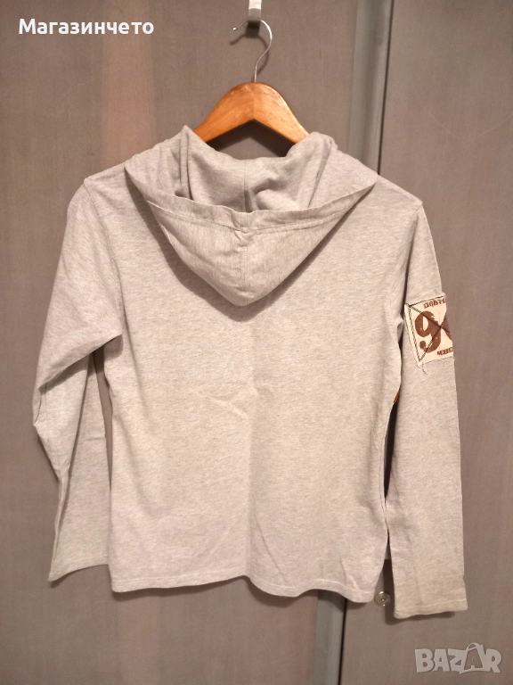 Блуза с дълъг ръкав и качулка в светлосиво, с декоративна апликация отпред и спортен акцент на ръкава. Материята е памучна, супер стегната и качествена.