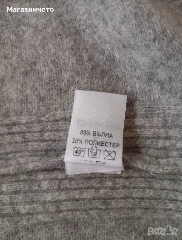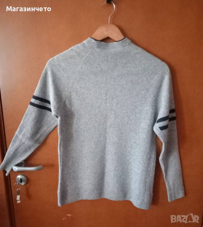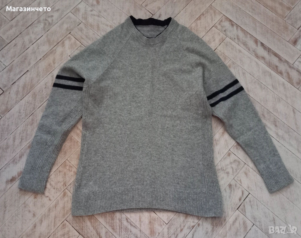 Топъл вълнен пуловер на българската марка DINO, в светлосив цвят с тъмни акценти на ръкавите. Като нов, обличан е 1-2 пъти, вълната е гладка и без никакви топченца или захабяване.