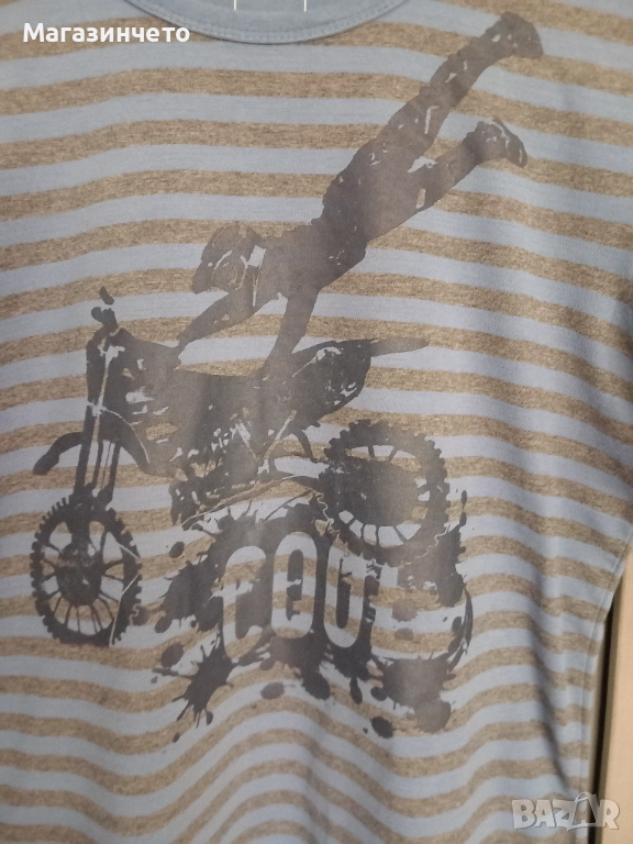 Блуза с дълъг ръкав на марката NAME IT, в синьо и сиво райе, с интересен мотор крос принт отпред. Материята е памучна, супер стегната и качествена.