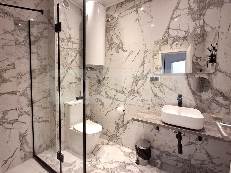 Луксозна баня, изпълнена с висок клас мраморни плочи и стъклена душ кабина