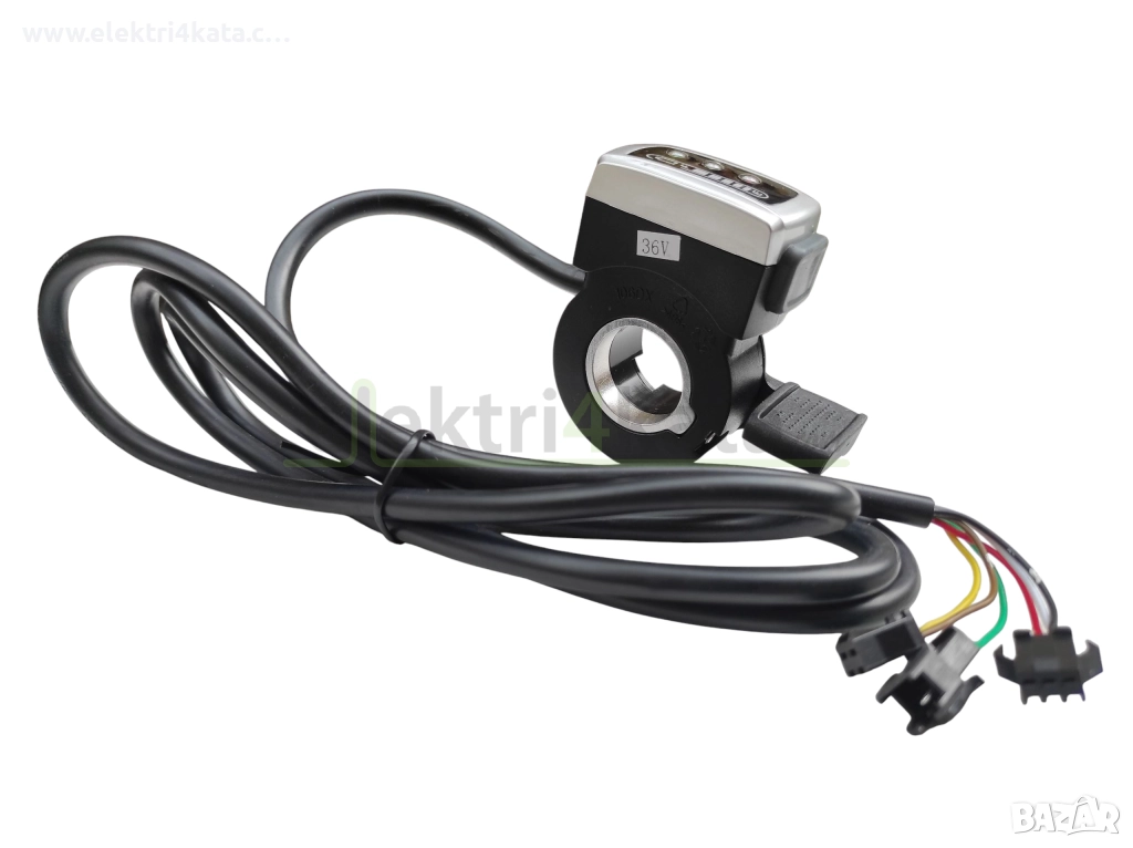 Акселератор (палец) за газта 36V с индикатор показва състоянието на батерията и е оборудван с бутон в долната част, който е подходящ за различни режими: ниска и висока предавка, задна скорост, бутон за фарове, круиз контрол, както и за включване/изключване на електрическото превозно средство.