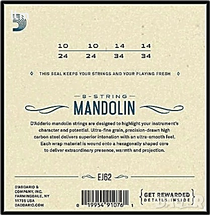 Всички струни D'Addario са проектирани, конструирани и произведени в САЩ. EJ62 е комплект струни за мандолина от лек бронз 80/20. 80/20 бронз, оригиналната акустична сплав, въведена от Джон Д'Адарио-старши и Джон Д'Анджелико през 30-те години на миналия век, е популярна сплав за запис поради своя чист, дълбок и изключителен тон и е привлекателна за много традиционалисти и любители на винтидж музиката заради историческото си значение.