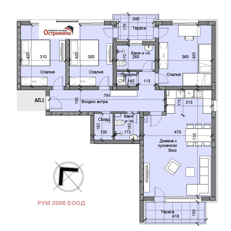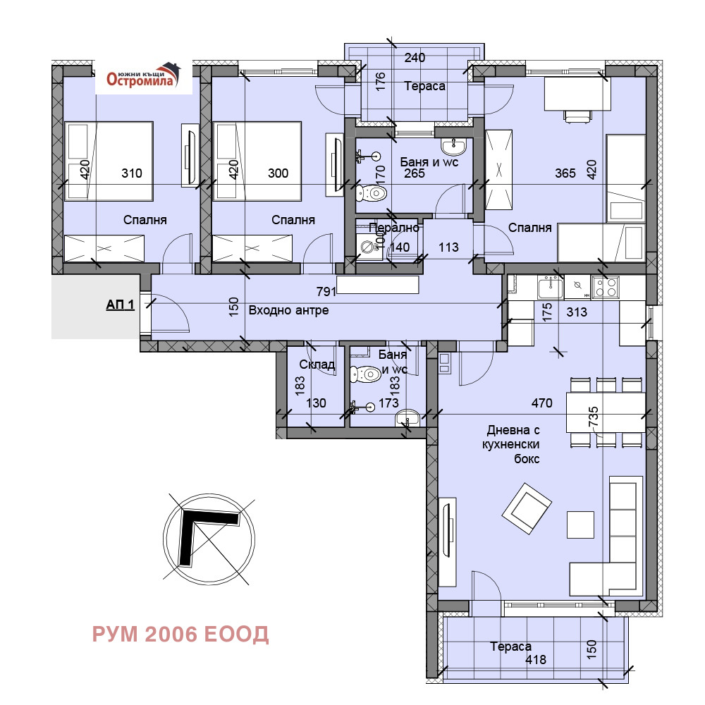 С АКТ 14!!! ДИРЕКТНО ОТ ИНВЕСТИТОРА!!! Предлагаме просторен четиристаен апартамент N 1 в Секция Г(същият апартамент с гараж се предлага и в секция А) 'Южни къщи 18' с жилищна площ 130,57 кв.м., които са разпределни между прекрасна дневна с кухненски бокс, три спални, две бани с тоалетни, перално, склад и две тераси. Към апартамента се продават по избор изба, гараж/паркомясто с отделна цена, полагаемите се общи части от сградата и прилежащата към имотите земя. Комплексът е от затворен и се състои от четири секции. Секция А е с четири жилищни етажа по четири апртамента на етаж. Управлението на комплекса ще се осъществява по начин избран от собствениците, т.е. няма предварително фиксирани такси и ангажименти за бъдещите собственици.
