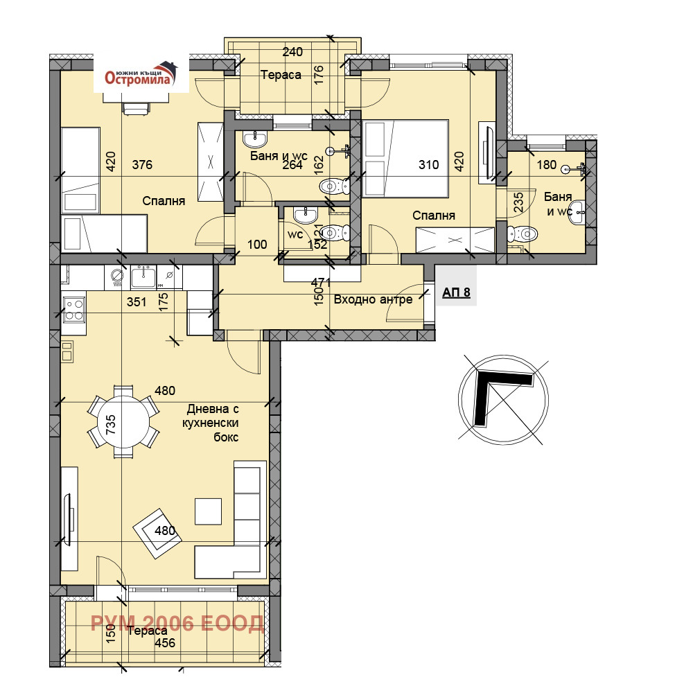 С АКТ 14!!! ДИРЕКТНО ОТ ИНВЕСТИТОРА!!! Предлагаме просторен тристаен апартамент N 8 в Секция Г(същият апартамент се предлага и в секция А) 'Южни къщи 18' с жилищна площ 110,73 кв.м., които са разпределни между прекрасна дневна с кухненски бокс, две спални, две бани с тоалетни, отделна тоалетна и две тераси. Към апартамента се продават по избор изба, гараж/паркомясто с отделна цена, полагаемите се общи части от сградата и прилежащата към имотите земя. Комплексът е от затворен и се състои от четири секции. Секция А е с четири жилищни етажа по четири апртамента на етаж. Управлението на комплекса ще се осъществява по начин избран от собствениците, т.е. няма предварително фиксирани такси и ангажименти за бъдещите собственици.