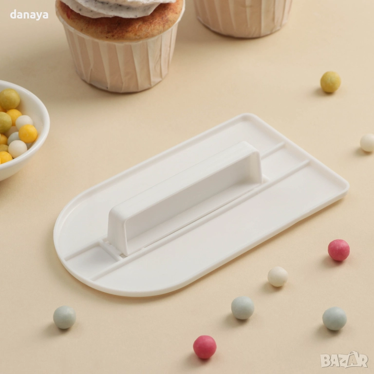 Сладкарска шпатула с дръжка. Сладкарски инструмент за заглаждане на фондан, сметана и други глазури. Изработена от пластмаса, с удобна дръжка за лесна работа.