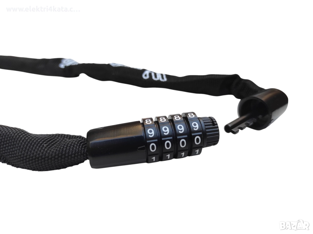 Заключващата верига с код ще защити превозното ви средство от кражба. Механизмът е изработен от стоманена верига, а заключването става с комбинация от 4 цифрен код, който ще настроете бързо и лесно. Веригата е с дължина от 65 см и ви дава възможност да го използвате върху стълбове, греди и т.н.