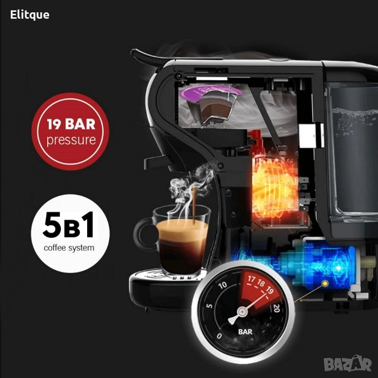 Мощност: 1650 W; Налягане: 19 бара; Опция за късо и дълго кафе; Светлинен индикатор; Възможност за ръчно или автоматично спиране; Режим на готовност след 15 минути; Тегло: 3,880 кг.; Размери: Дължина 365 мм., ширина 150 мм., височина 291 мм.; Вместимост на резервоара за вода: 600 мл.; Материал на корпуса: Пластмаса; Система за варене с нагревателен елемент; Отделящ се прозрачен резервоар за вода; 5 различни адаптера за кафе: Долче густо (Dolce gusto), Неспресо (