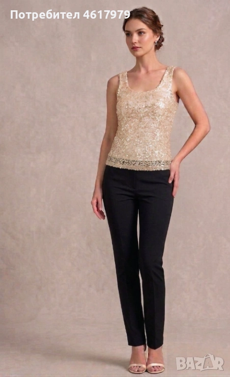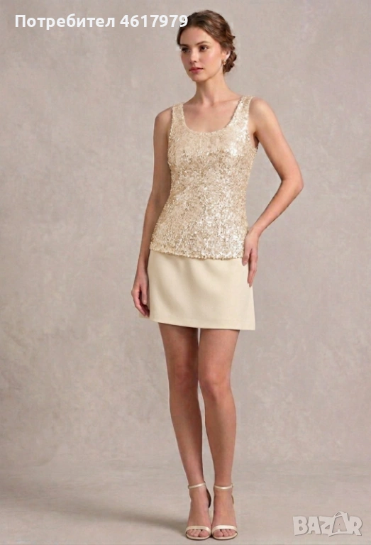 Пайетирана материя. Прав дизайн. Кръгло деколте. Без ръкави. Широки презрамки. Без закопчаване. Вътрешна подплата. Цялостна визия. Колекция за партита и официални церемонии.