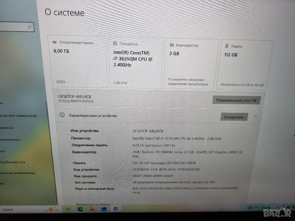 Продавам лаптоп Samsung ATIV Book 8 NP-870Z5E-X01 в много добро състояние. Лаптопа е с допълнителна клавиатура (кирилица) и в момента системата е на руски език, ама може да премина на български през настройките. Върви с оригинално зарядно. Дисплея е 15.6" 1920x1080 Full HD LED IPS. Вместо фабричен HDD инсталиран е SSD Samsung 128GB. Инсталирана и активирана е Windows 10 22H2 Home с последни обновявания. Батерията е сменена наскоро и има 100% капацитет.
