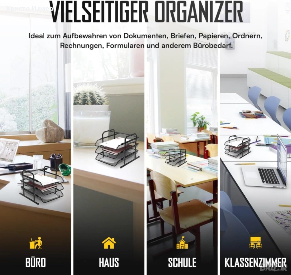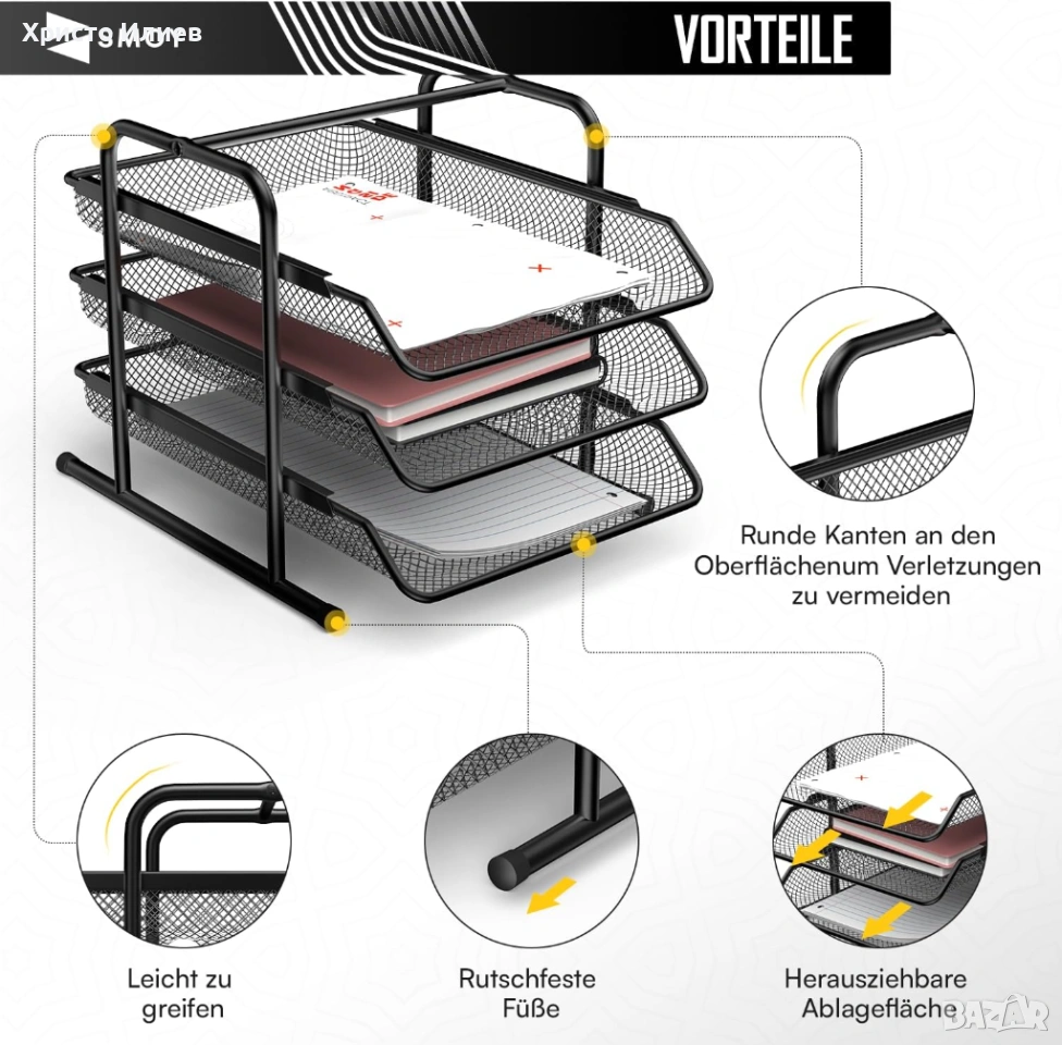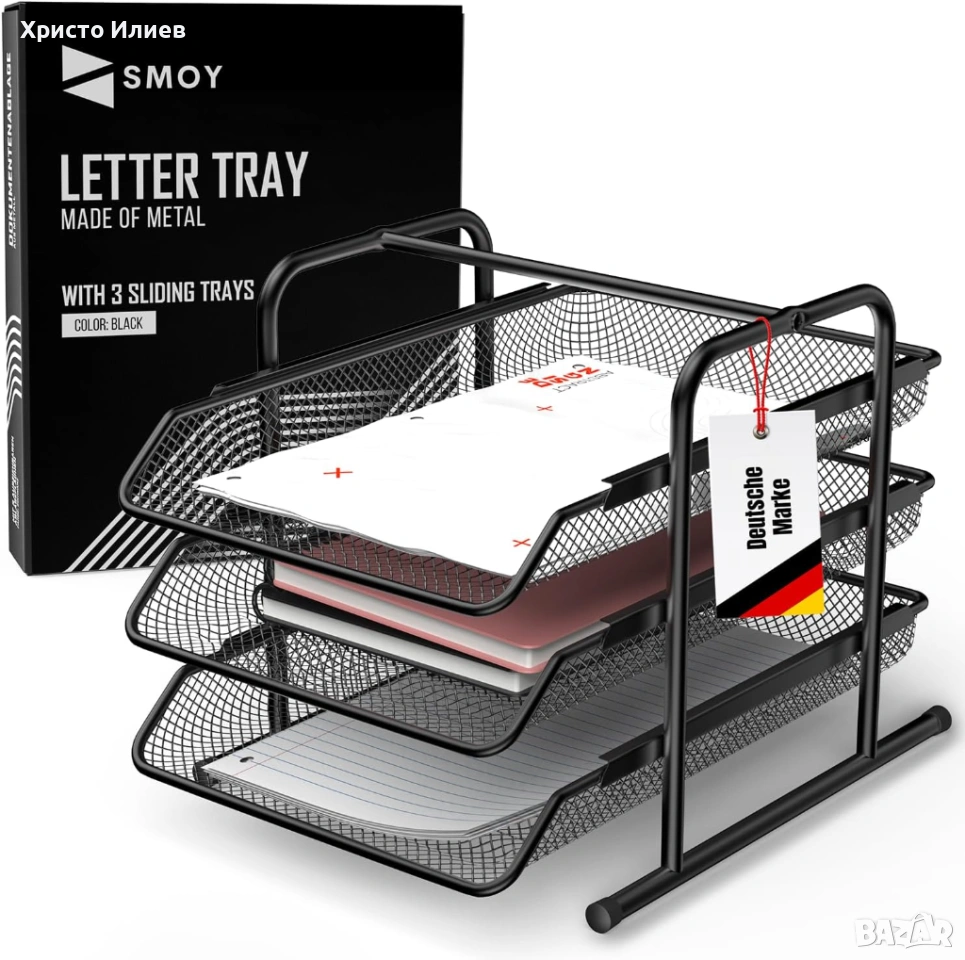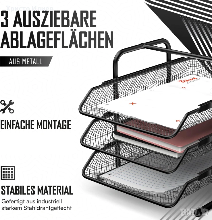 Метална тава за документи - 3-степенен органайзер за бюро с мрежест дизайн (черен)
