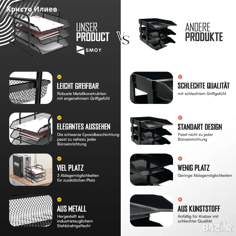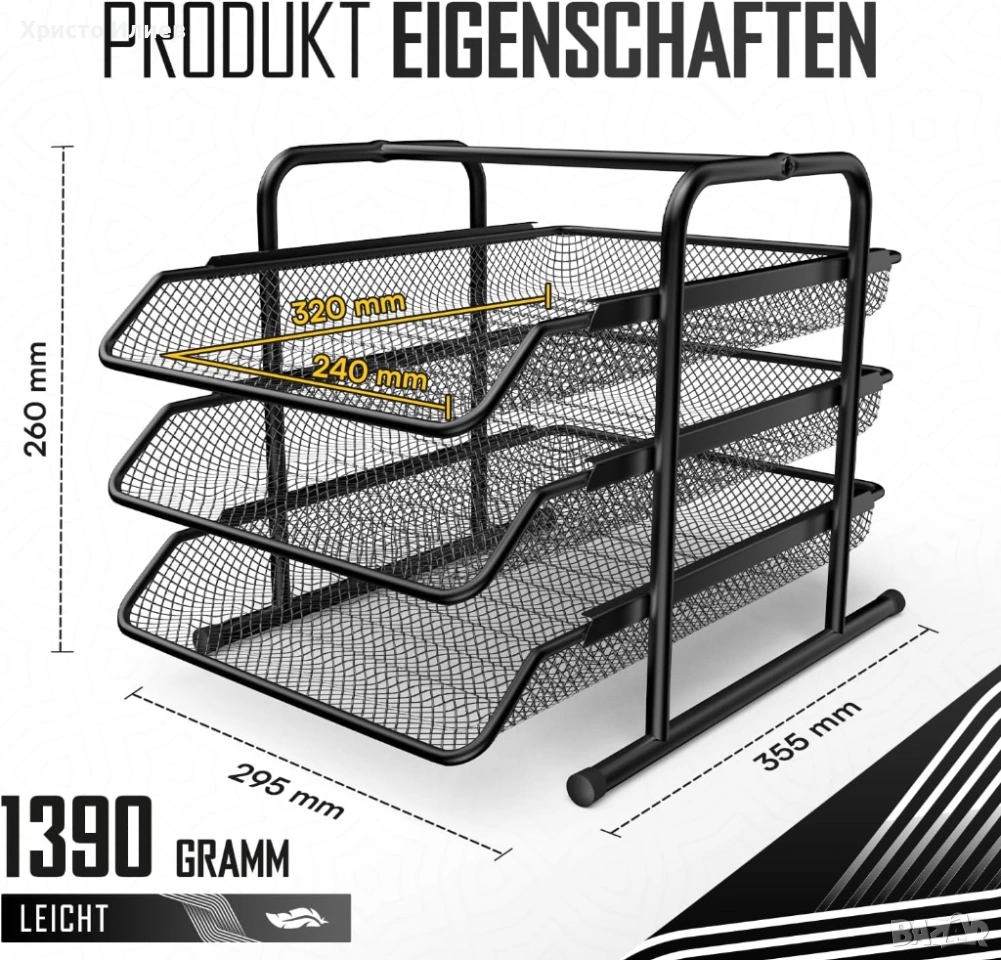 Внесете ред на бюрото си с тази 3-степенна метална тава за документи. Отвореният мрежест дизайн осигурява добра вентилация и модерен вид, а здравата метална конструкция гарантира издръжливост. Идеална за писма, документи, тетрадки или файлове.