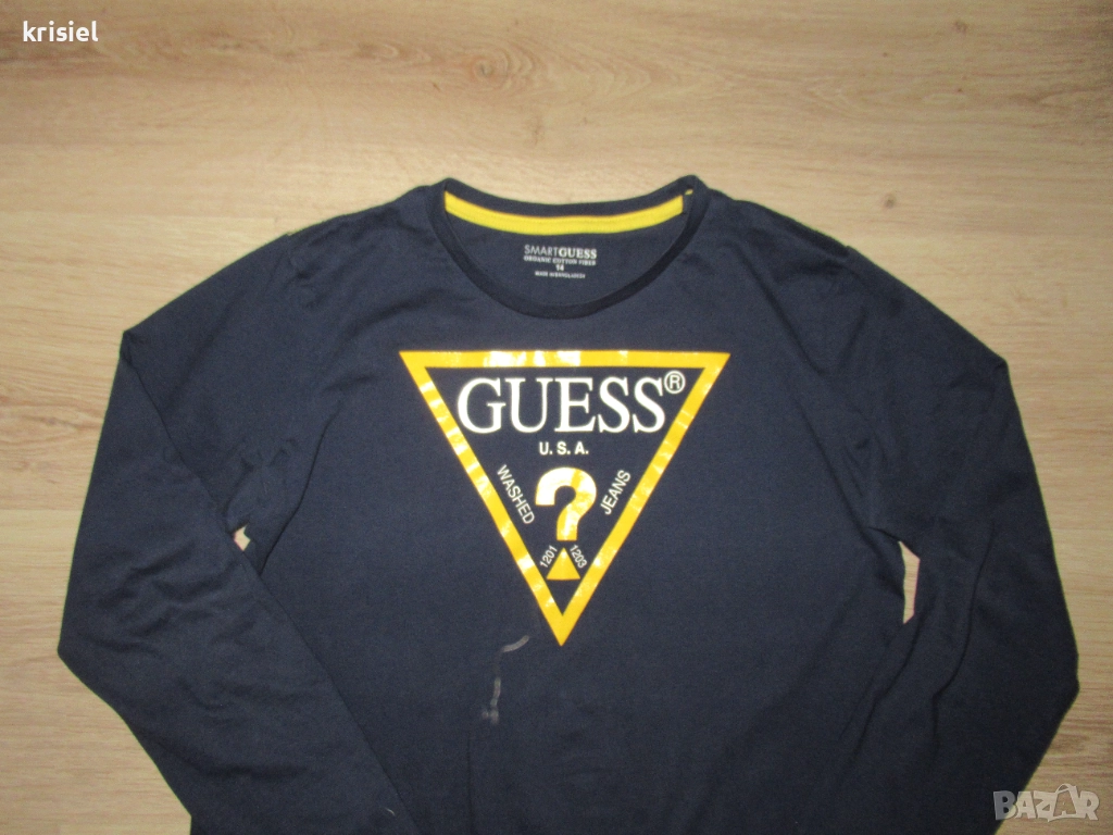 Блузата е отлична,без никакви забележки.Оригинална на GUESS.По етикет 14 год.Супер мека памучна материя.С жълто лого на марката.Размерите са:дължина-59см,гърди-48см,от рамо до рамо-36см,ръкав от рамо-54см,от мишница-44см