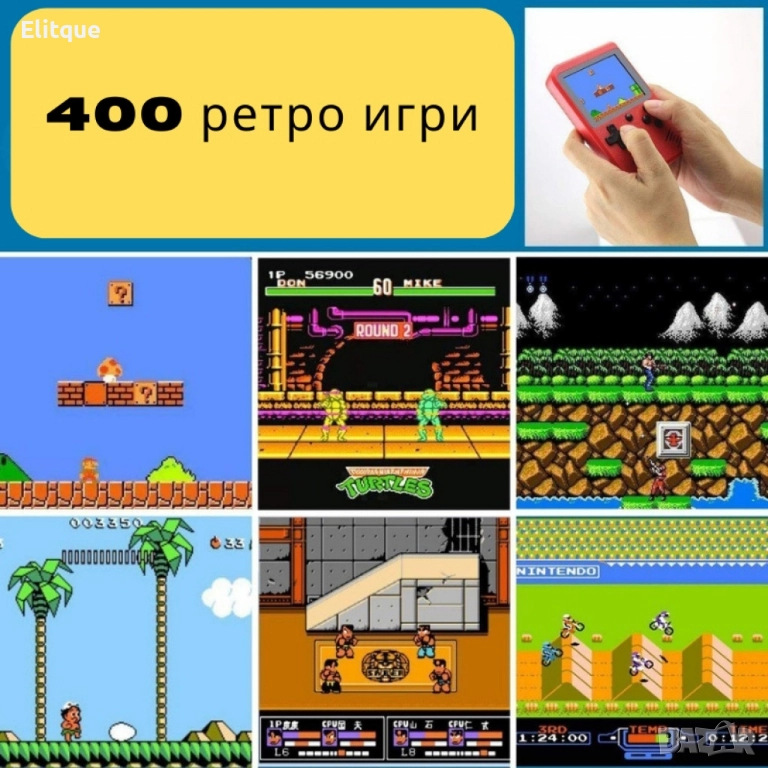 Модел: SUP 400 in 1 Брой игри: 400 вградени ретро игри Процесор: 8-битов Екран: 3.0'' цветен LCD дисплей Резолюция: 320 × 240 px Батерия: 800 mAh акумулаторна литиево-йонна, сменяема Време на работа: до 6 часа с едно зареждане Време за зареждане: около 2 часа Зареждане: USB кабел (включен) Възможност за свързване към телевизор: Да (AV кабел включен) Джойстик за втори играч: Да (включен в комплекта) Звук: Вграден моно високоговорител + контрол на звука Материал: ABS удароустойчива пластмаса Размери на конзолата: 11.5 × 7.8 × 2.2 см Тегло: около 110 г Захранване: 5V USB Меню: Многоезично (английски по подразбиране) Поддръжка на формати: Вградени игри (не поддържа добавяне на нови) Операция: Ръчно управление с бутони Работна температура: 0°C до 40°C