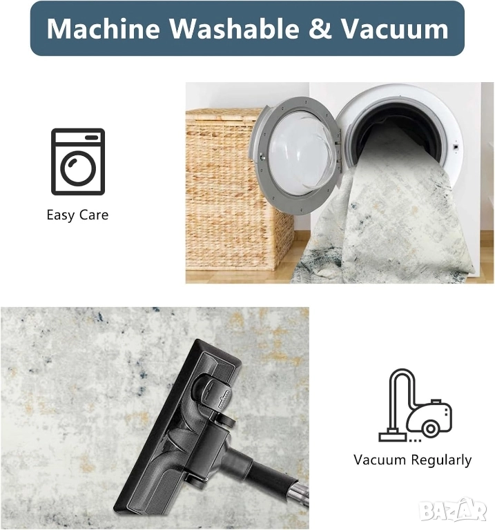 Продуктът е създаден с фокус върху лесната поддръжка. За рутинно почистване се препоръчва използването на прахосмукачка. При леки петна е достатъчно избърсване с влажна кърпа. Килимът е подходящ за машинно пране (моля, използвайте студен цикъл и мек препарат) или ръчно пране, което гарантира дълготрайна хигиена и свежест.