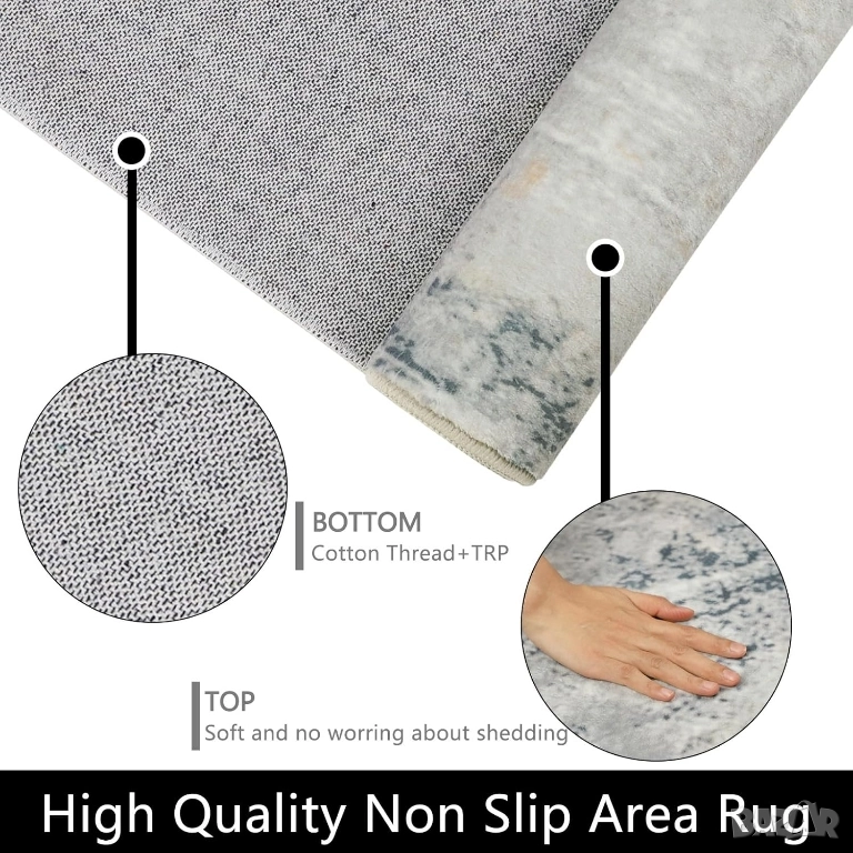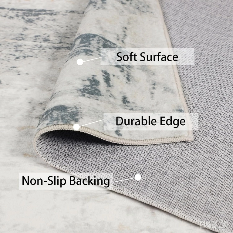 | Подложка | Комбинация от памучна нишка и TPR (Термопластична гума) | Осигурява противоплъзгащ ефект и защита на подовото покритие. |
