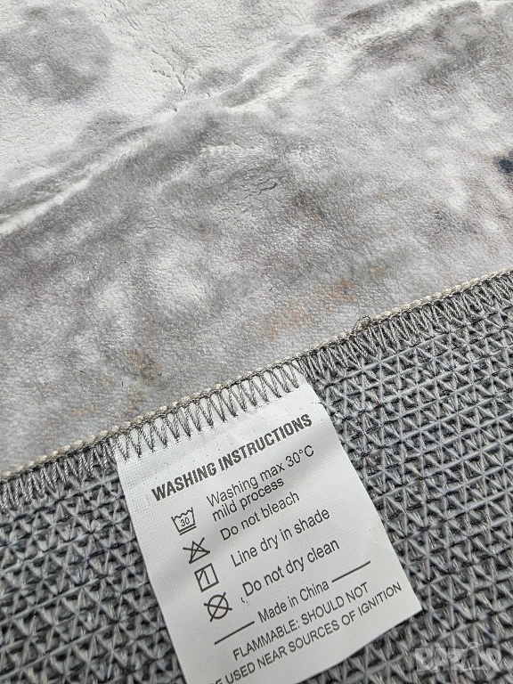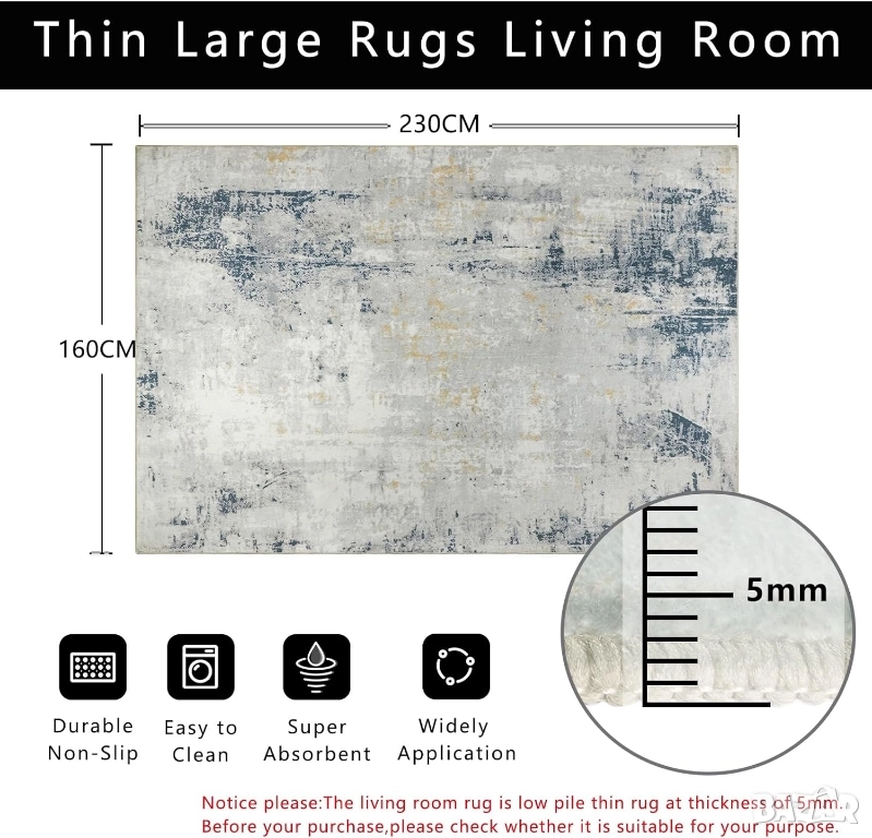 - Важна Забележка: Килимът се транспортира сгънат. Ако при получаване има гънки, препоръчва се поставянето на тежък предмет върху засегнатите зони за кратко време или леко гладене на гърба с ниска температура. Моля, обърнете внимание, че това е тънък килим с нисък косъм (5 mm) – уверете се, че този профил отговаря на Вашите нужди преди покупка.