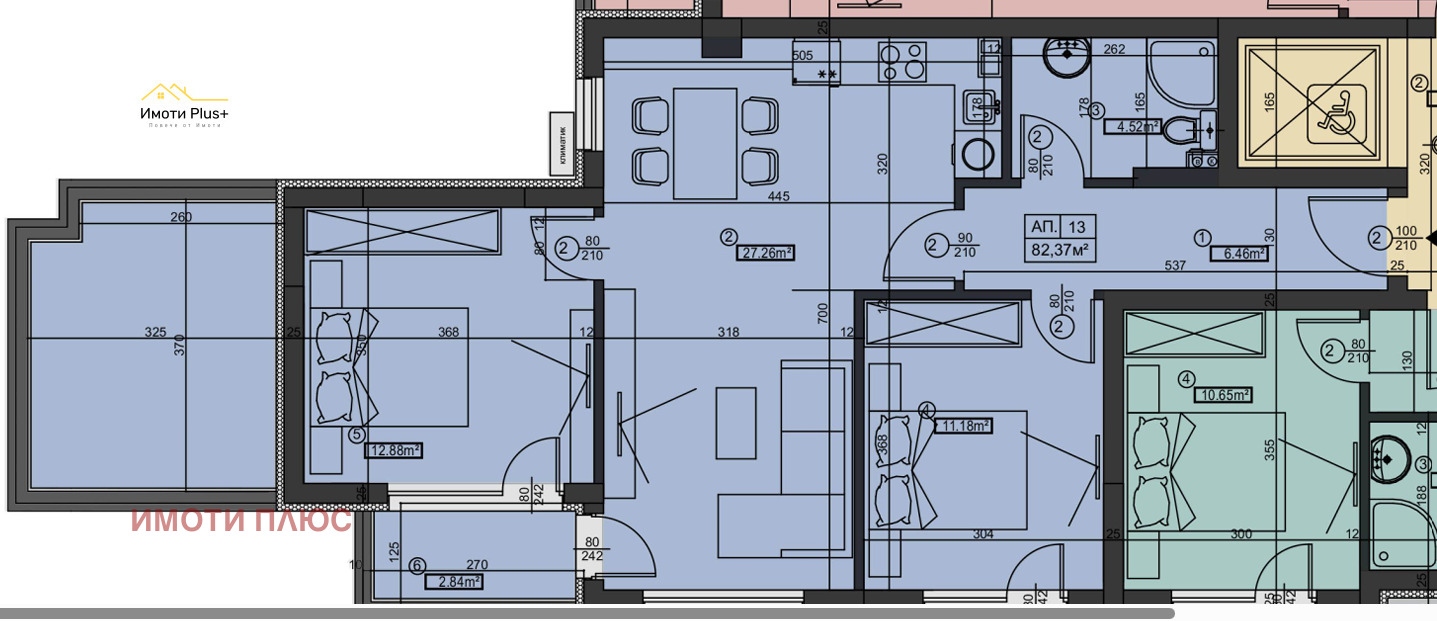РАЗПРЕДЕЛЕНИЕ: Жилището разполага с площ обща 98,41 м2, застроена площ - 82,37 м2, разпределени в Дневна, кухня и трапезария; 2 спални; 1 баня с тоалетна.