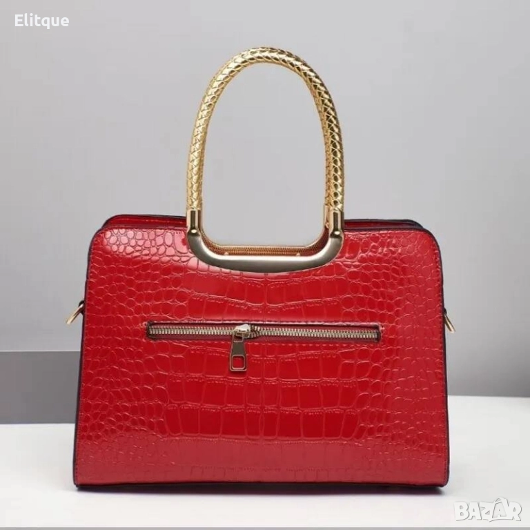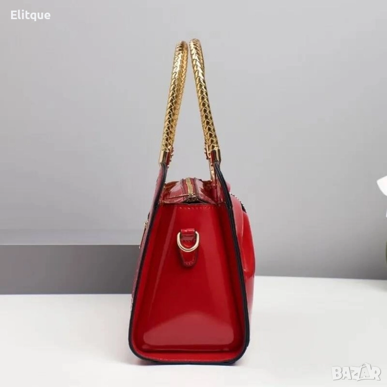 Елегантна дамска чанта Размери Височина - 20 см., Ширина - 28 см., Дъно: 12 см. Елегантна лачена чанта от качествена еко-кожа чантата има две отделения, преграда-джоб с цип два малки джоба и джоб с цип във вътрешността джоб с цип на обратната страна на чантата дълга дръжка за през рамото състав: еко-кожа, хастар - полиестер Цена:55лв Еконт и Спиди