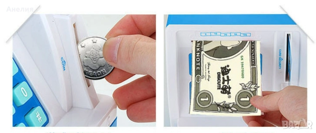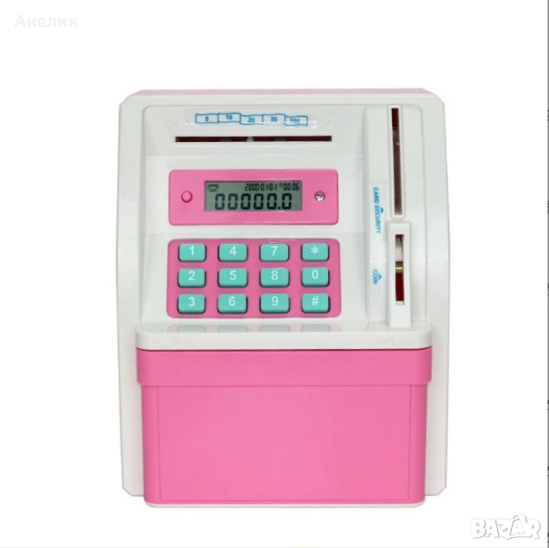 Сейф за деца тип „банкомат“ отваряне с парола / С процеп за банкноти; С процеп за монети; С парола; Опростен, но стилен дизайн; Интересна, цветна визия; Преносим и лесен за съхранение; С екран;