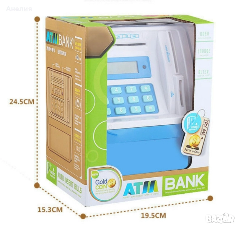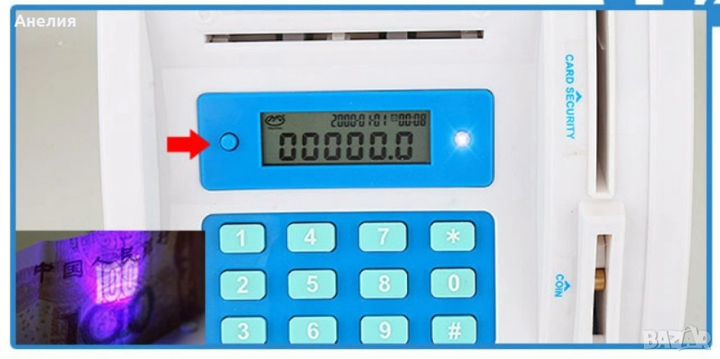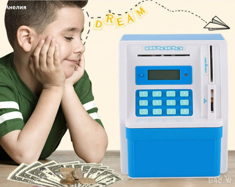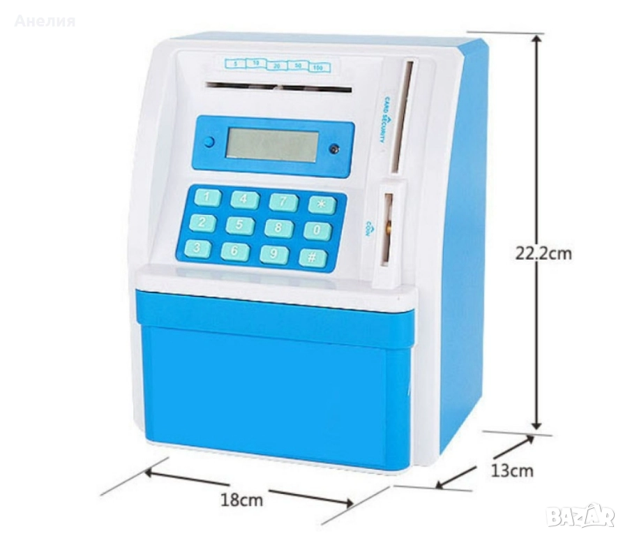 Сейф за деца тип „банкомат“ отваряне с парола / С процеп за банкноти; С процеп за монети; С парола; Опростен, но стилен дизайн; Интересна, цветна визия; Преносим и лесен за съхранение; С екран;