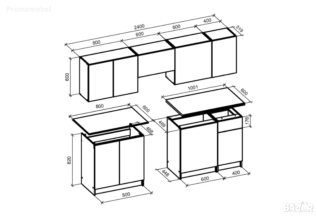 *Размери: Горен ред: 240/31,9/60 см. /Долен ред (с термоплот): 180/60/84,8 см. /Дълбочина на долен шкаф (без термоплот): 44,6 см. /Широчина шкаф подходящ за вградена мивка: 80 см. /Място за стояща готварска печка: 60 см. /Термоплот ширини: 100+80 см.