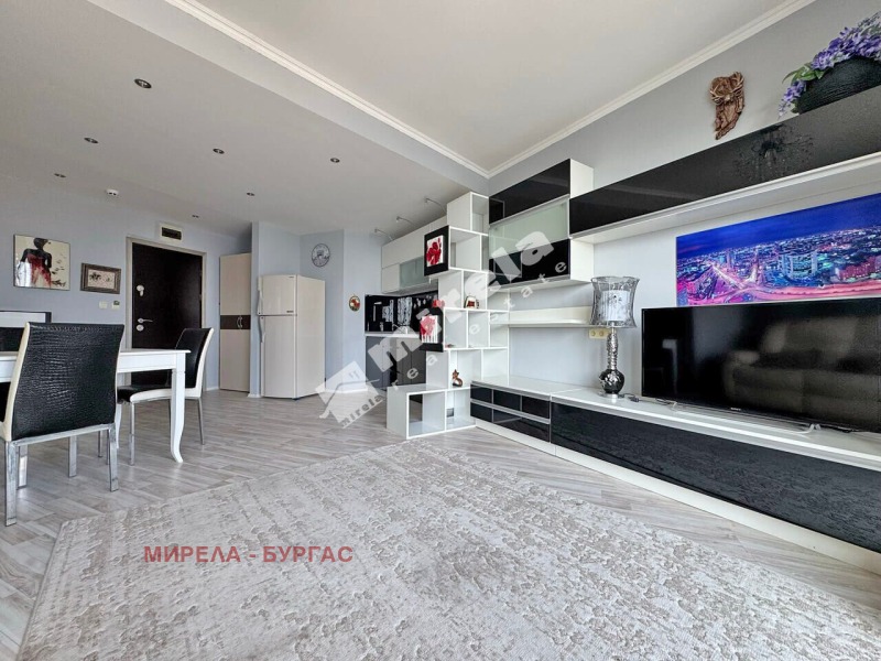Апартаментът е разположен на 6-ти последен етаж с панорамна гледка към морето и планината, и е с разпределение: коридор, просторна светла свекидневна с кухня с излаз към тераса, една голяма спалня с излаз към тераса, просто баня със санитарен възел и голяма тераса. Имотът е луксозно обазаведен с всичко необходимо, както за лично ползване така и за инвестиционна цел.