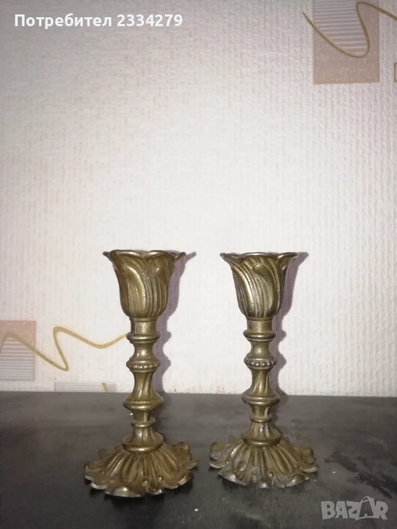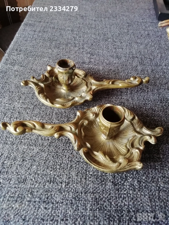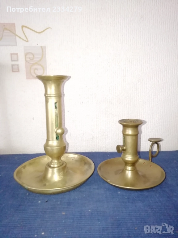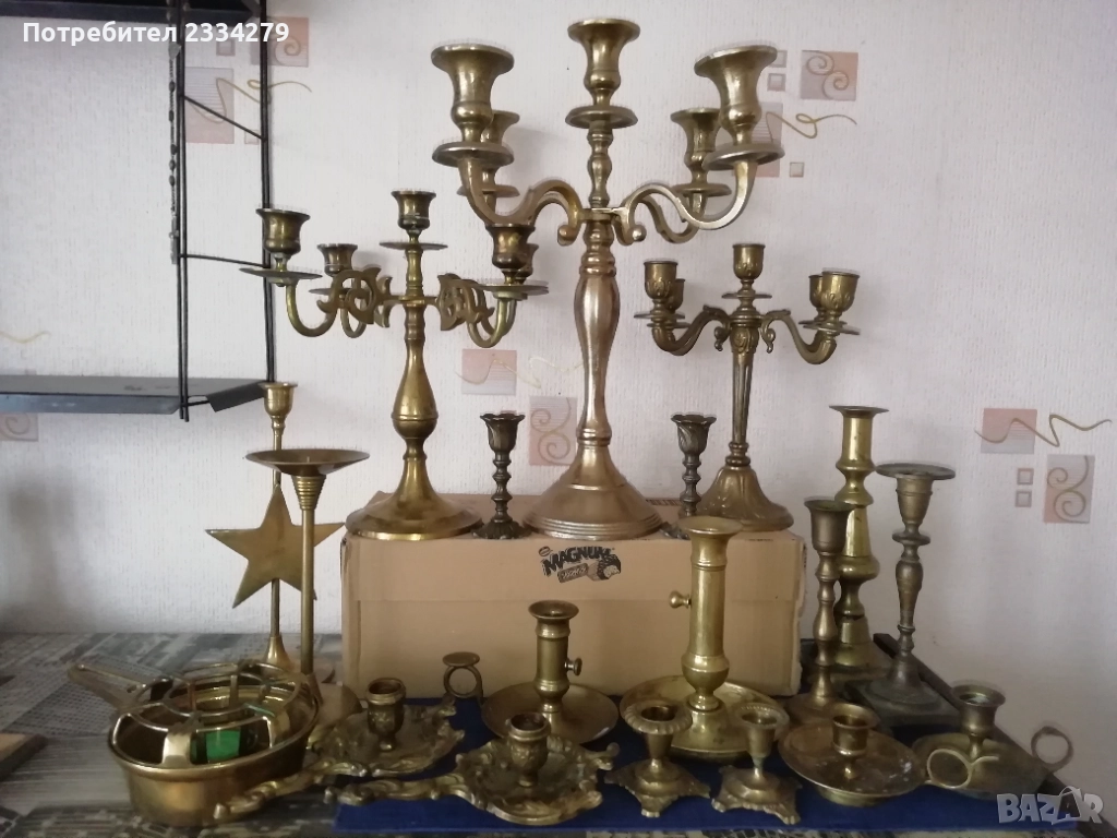 свещници. N:1 масивни стари бронзови свещници, класическа барокова изработка с пет гнезда, описание от ляво на дясно: първият висок 30см.,широк 30см.,тежи 2кг., цена 26€., вторият размери 42х35см.,1кг.800гр., цена 28€., третият е 25х25см.,1кг.400гр.,цена 25€.; N:2 от ляво на дясно първият и последният английски корабни свещници с повдигащо гнездо за свеща, размери 18х13см. и 14х11см., цена 16€. брой, другите класически единични високи от 20см. до 26см., цени от 5 до 10. €.; N:3 от ляво на дясно първият стар бронзов свещник или спиртни-котлон с размер 24х7см.,тегло 700гр., цена 12€, вторите чифт масивни бронзови, флоренциански стил с размери 20х6см., тегло 600гр., цена 18€. двата, третите чифт бронзови с размери 10х5см., 10€. за двата, четвъртите два броя размери 7х6см., цена 4€. двата, петите два броя с размери 13х6см.,3€. брой.