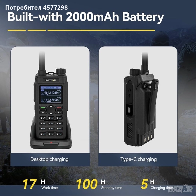 Време за употреба и 100 часа в режим на готовност позволяват целодневна употреба на открито без често зареждане. Type-C портът с 2 метода на зареждане ефективно и удобно удължава живота на радиото. Не е нужно да се притеснявате, че батерията ще се изтощи и ще повлияе на нормалната ви употреба за цял ден дейности на открито.