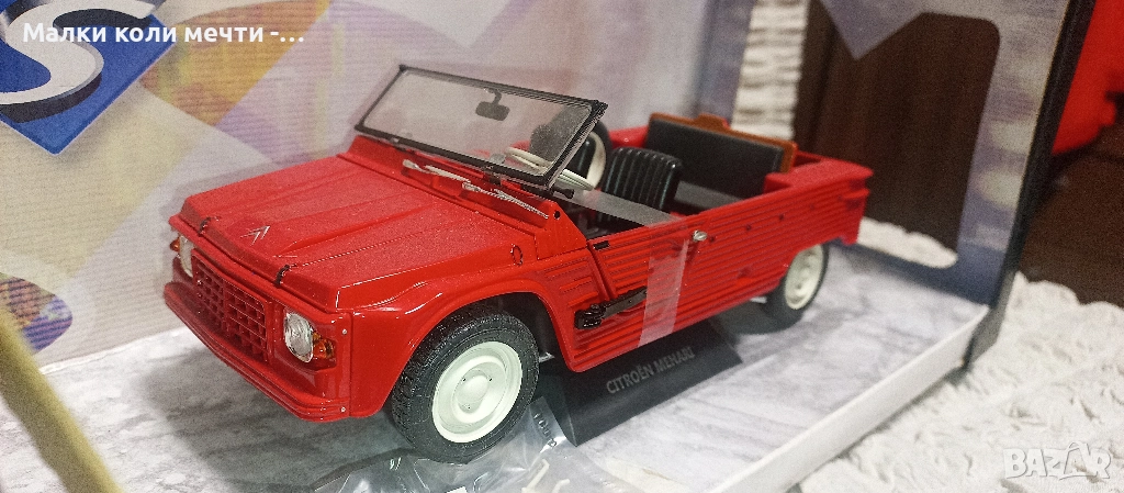 3..- Citroen Mehari - 1970 г. Мащаб 1:18 (20 см. дължина ). Забележки няма, колата няма кутия само с поставка е. Огледалата фабрично са сложени в пликче и не са вадени от там и не са поставени на колата, налични са. Производител Solido. Цена 65 лв