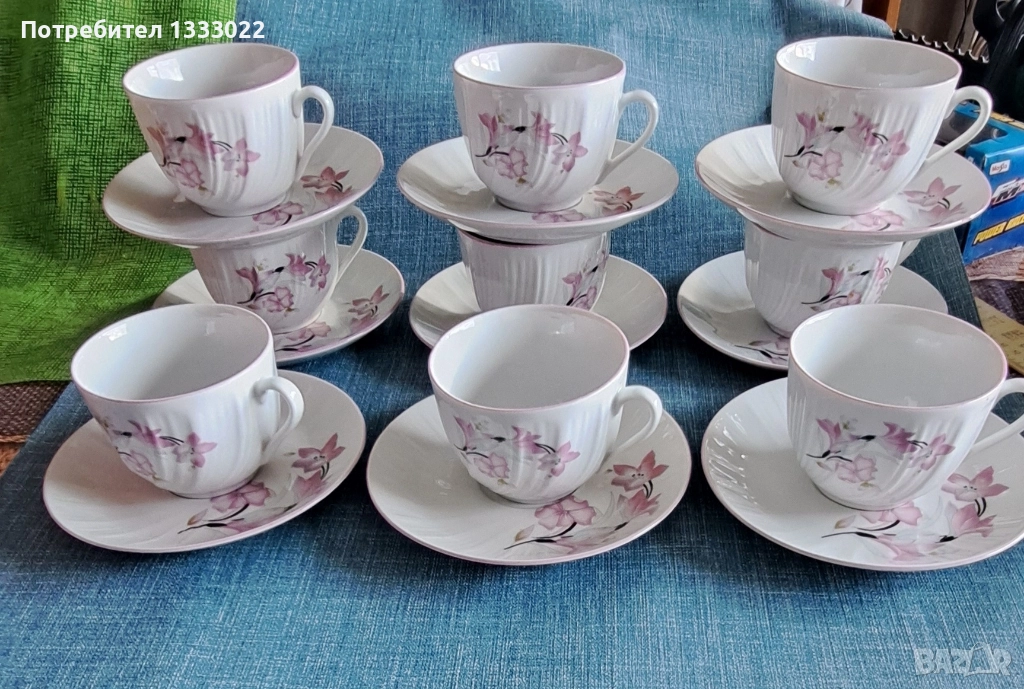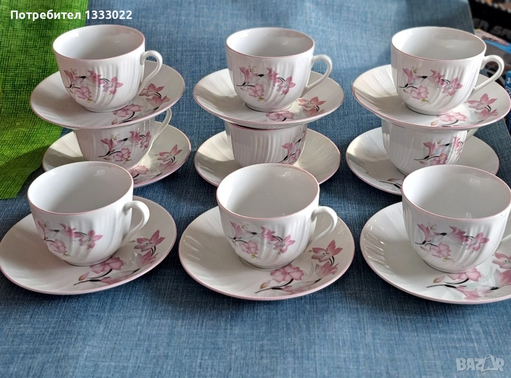 Порцеланови чаши 9 бр и 9 бр чинийки. Височина на чашата 6,5см и диаметър 9см Всичко е ново неизползвани.