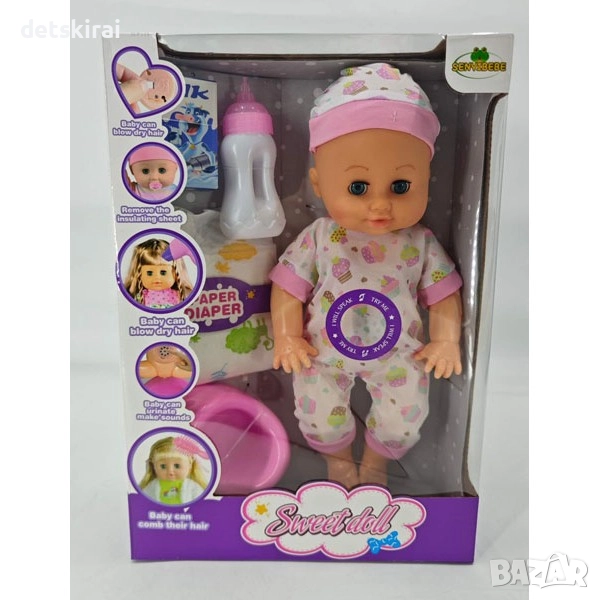 Музикално пишкащо бебе с памперс и шише – забавна и интерактивна играчка, която носи реалистично преживяване за всяко дете. Бебето издава мелодии, пие от шишето и пишка, което прави играта още по-интересна и образователна. Подходящо за ролеви игри, развиване на грижа, емпатия и въображение. Комплектът включва бебе, памперс и шише.