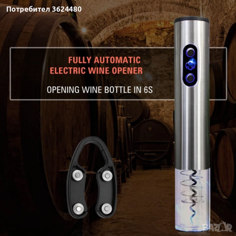 Пълен Комплект: Комплектът включва: Електрически тирбушон за отваряне на бутилки вино (1 бр.), Ножче за отстраняването на фолиото (1 бр.) и USB кабел за зареждане на батериите (1 бр.).