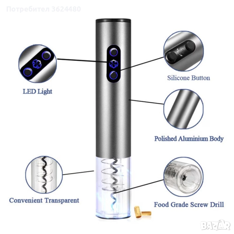Дизайн: Безжичният тирбушон е стилен аксесоар за вино комплект и чудесен подарък за всеки ценител.