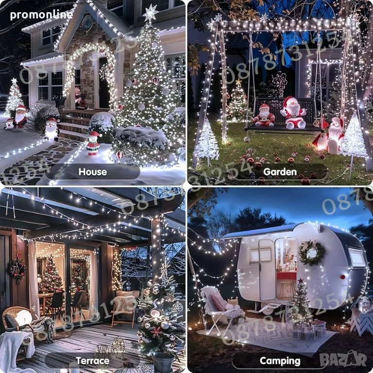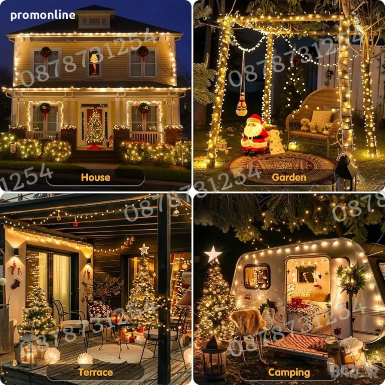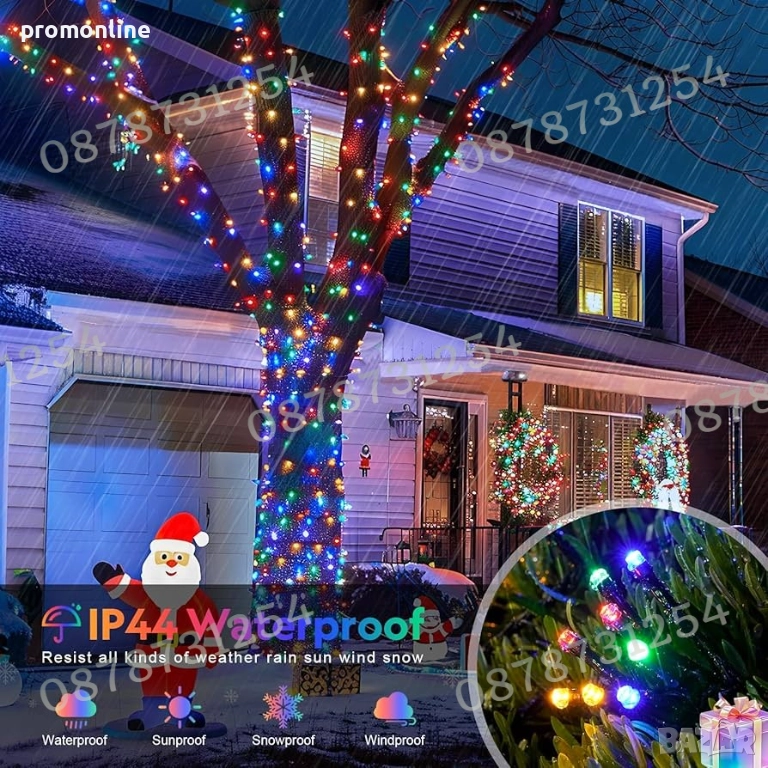 Светещ коледен гирлянд от 50 метра, коледни лампички с 250 ярки светодиода. Можете да си купите екстра дълги LED гирлянди, които са достатъчни, за да обградят и украсят голяма коледна елха, хвърляйки топла, магическа светлина дори в най-студените зимни нощи. Външните коледни лампички изглеждат много ясни, а след като са запалени на тъмно, изглеждат по-големи и по-силни.