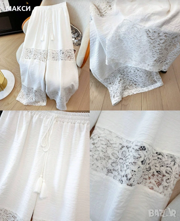 Макси красив ефирен панталон с широка и висока ластична талия + широки крачоли+ широки дантелени час → Обява 52471604